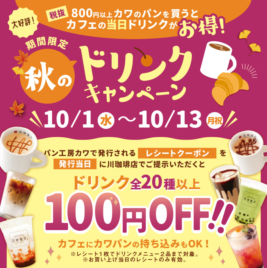 \カワパンを買うと、当日ドリンクが今だけお得!/